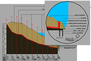 Projeto de reconstrução de talude erodido pelas chuvas. A reconstrução foi realizada em patamares, com descidas de água em degraus e valeta ao pé de cada patamar.